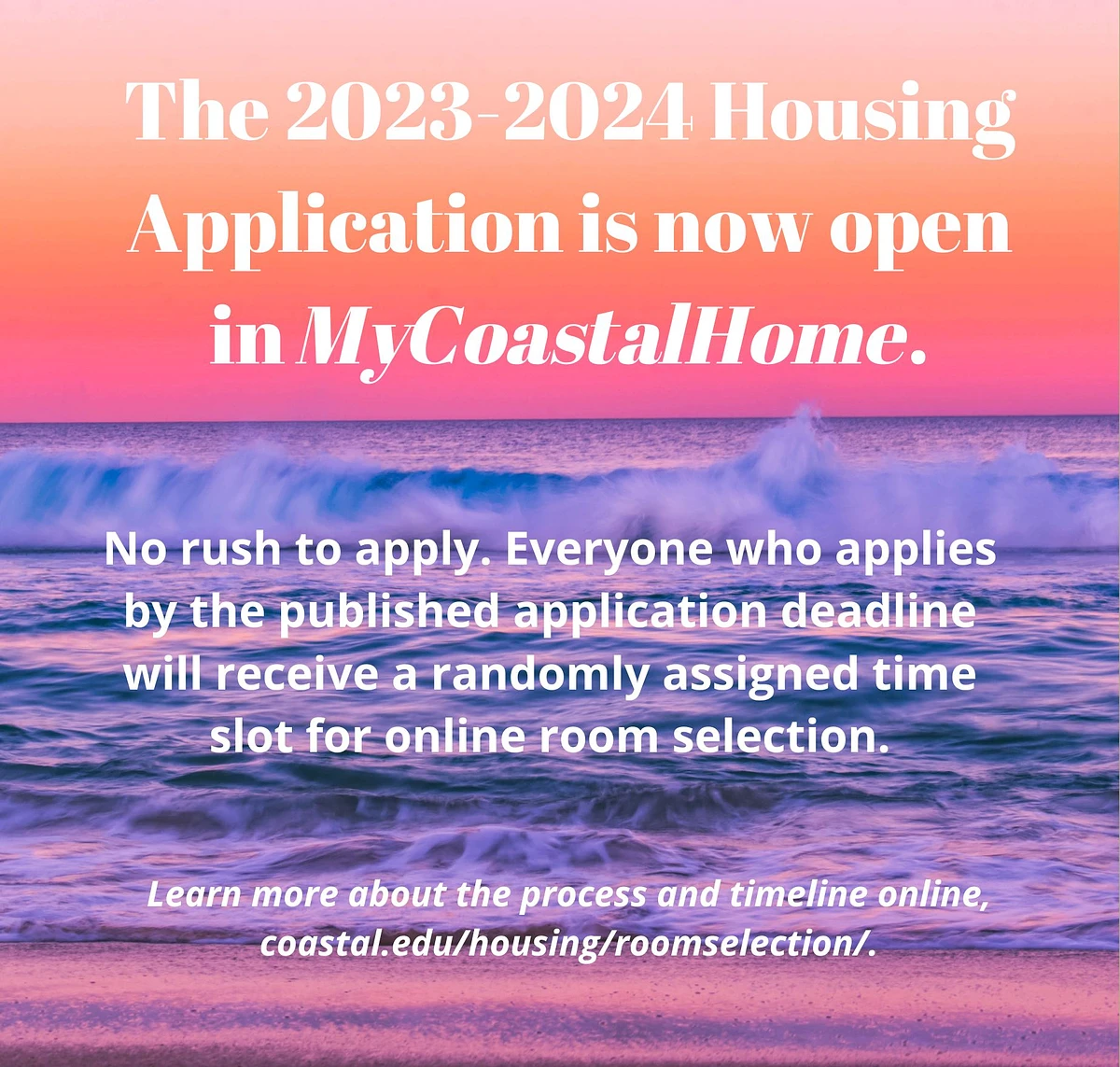 The 2023-2024 housing application is open in MyCoastalHome. Students planning to live on campus for next year should complete their application by the published deadline in order to select their space. Applications received after the deadline will be administratively assigned by University Housing. Learn more about the application and room selection processes online.